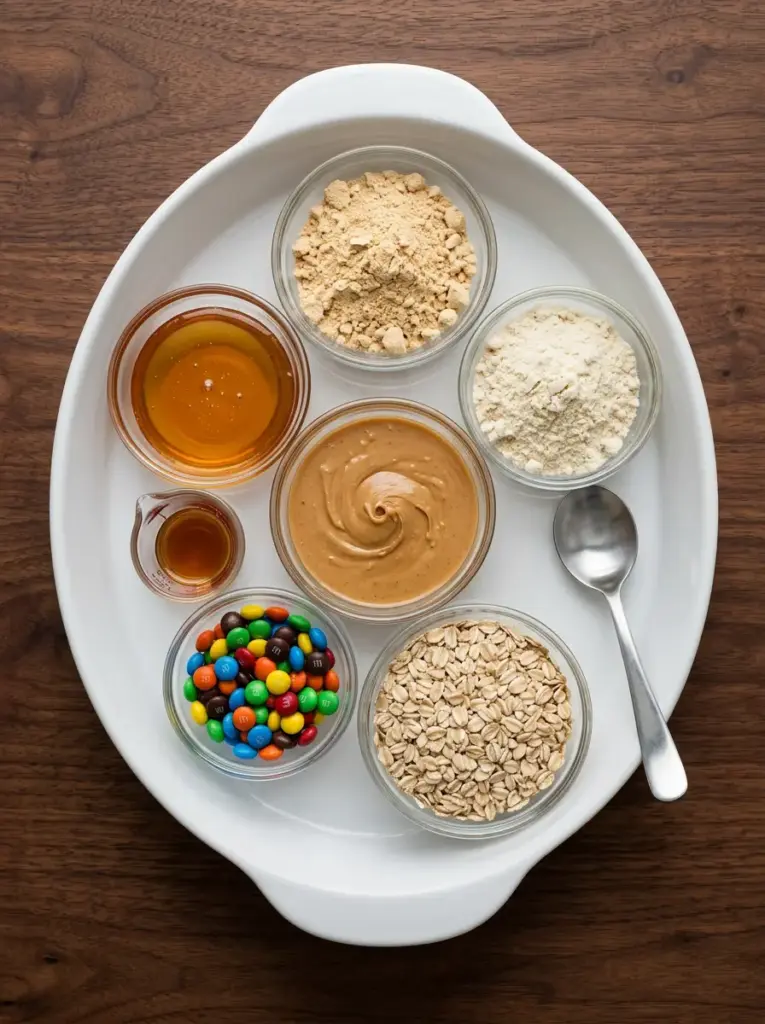 Fold in quick oats until fully incorporated — dough should be thick and slightly sticky. Add mini chips/M&Ms last (so they don’t melt). If too sticky, add 1 tbsp more powdered PB or oats.