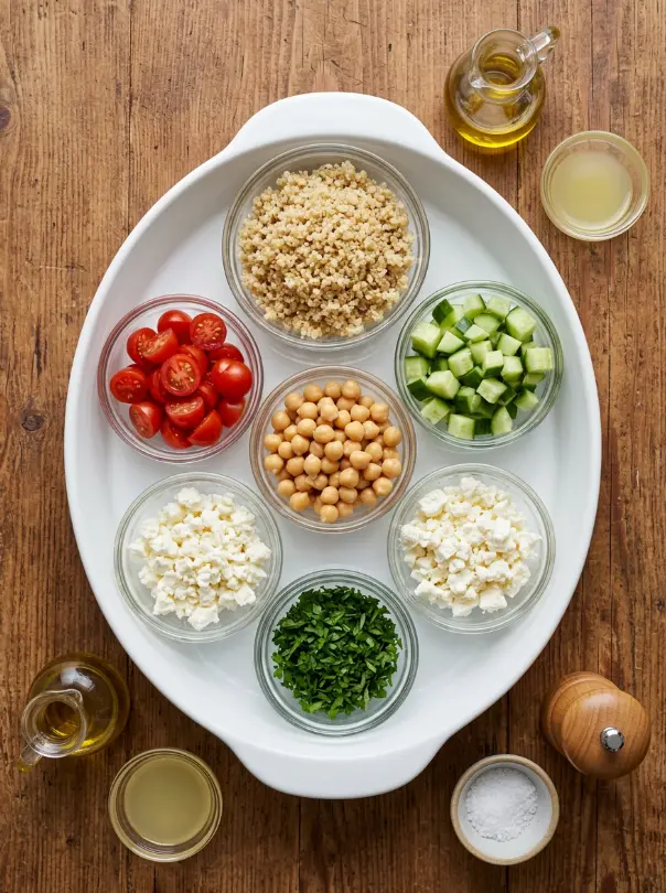 This high-protein salad serves 4 generous portions, making it perfect for family meals or weekly prep. We’ve kept the ingredient list simple, accessible, and bursting with sensory appeal—think juicy tomato pops, crisp cucumber crunch, and creamy feta that melts in your mouth. Here’s everything you need: