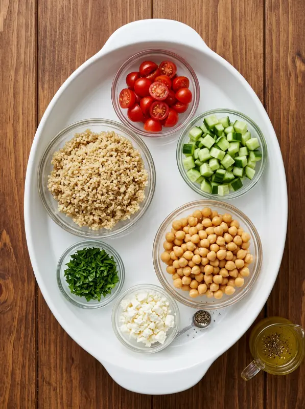This high protein salad shines with simple, wholesome ingredients that come together for a Mediterranean-inspired delight. The quinoa and chickpeas form the protein powerhouse, while fresh veggies add crunch and vibrancy. Here’s everything you need for 4 hearty servings: