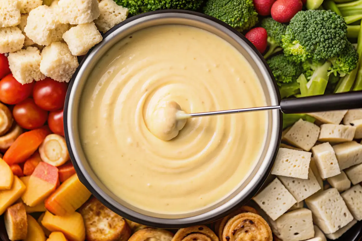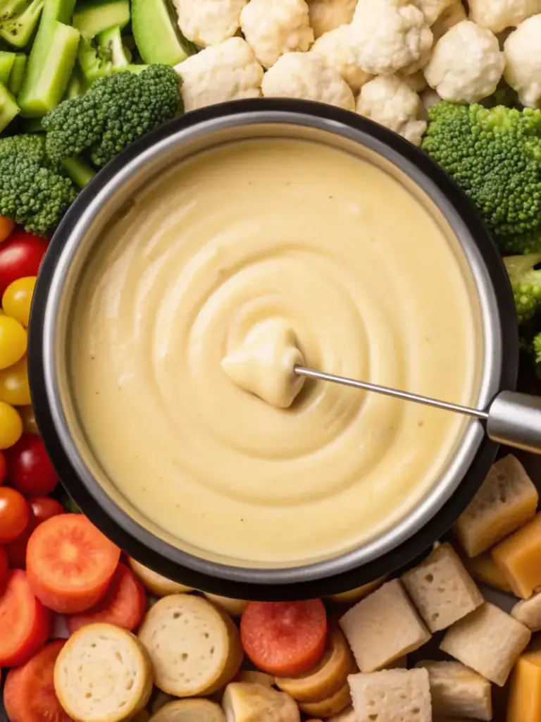 Artfully arrange your selection of dippers on a large platter, considering color contrast and variety. Transfer the fondue to your serving pot if necessary, maintaining gentle heat to keep the consistency perfect throughout your meal.