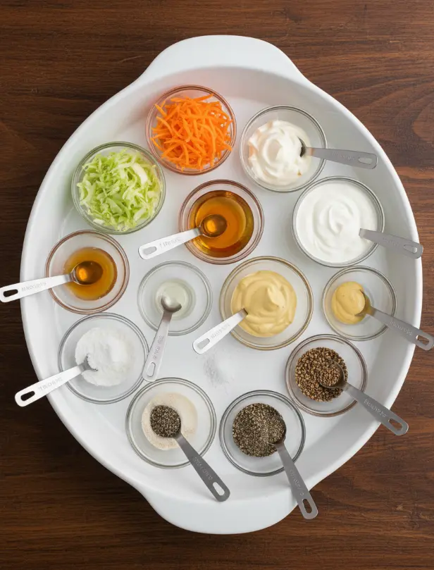 Before diving in, measure all ingredients into small bowls. This coleslaw dressing recipe hack prevents mid-mix mishaps and keeps things speedy. Imagine the smooth glide of your whisk through silky mayo – it’s therapeutic!