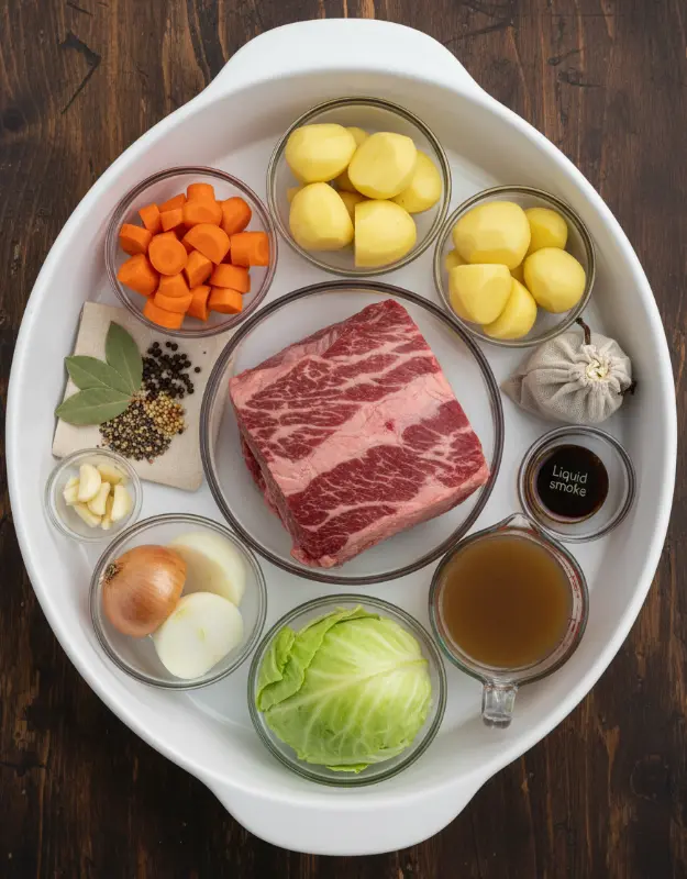 • 3–4 pounds corned beef brisket (with spice packet included): The star—salty, briny, and packed with savory depth. Sub: Low-sodium version for heart-healthy eats.