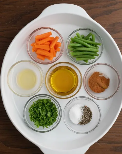 - 1 pound green beans, trimmed: Snappy, emerald-green pods for tender-crisp texture. Sensory tip: They balance the carrots’ softness with a fresh snap. Sub: Haricots verts for elegance or asparagus spears for variety.