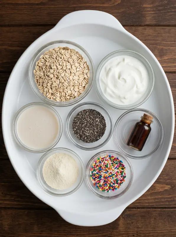 Gather these simple pantry staples for your birthday cake overnight oats—they come together in minutes for a dessert-for-breakfast explosion of vanilla, creaminess, and colorful crunch. Sensory note: Imagine the nutty earthiness of oats mingling with the silky tang of yogurt and pops of sweet sprinkles!