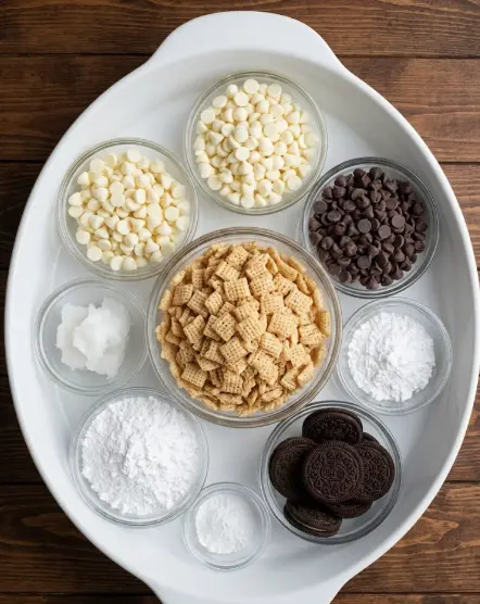 Cookies and Cream Puppy Chow Ingredients (Makes ~16 cups – trust me, make double)