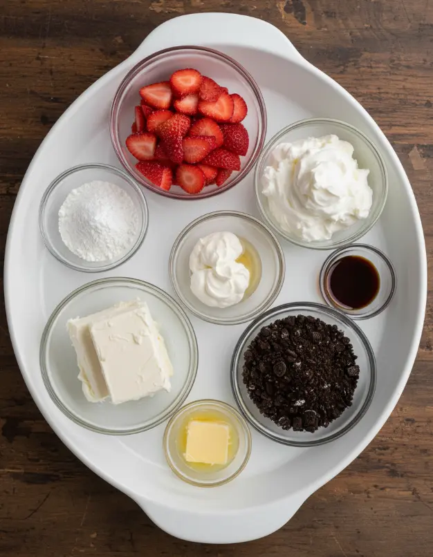 Gather these simple pantry staples and fresh picks for your no-bake strawberry crunch cheesecake. I’ve included sensory notes to get your mouth watering and smart substitutions for dietary tweaks: