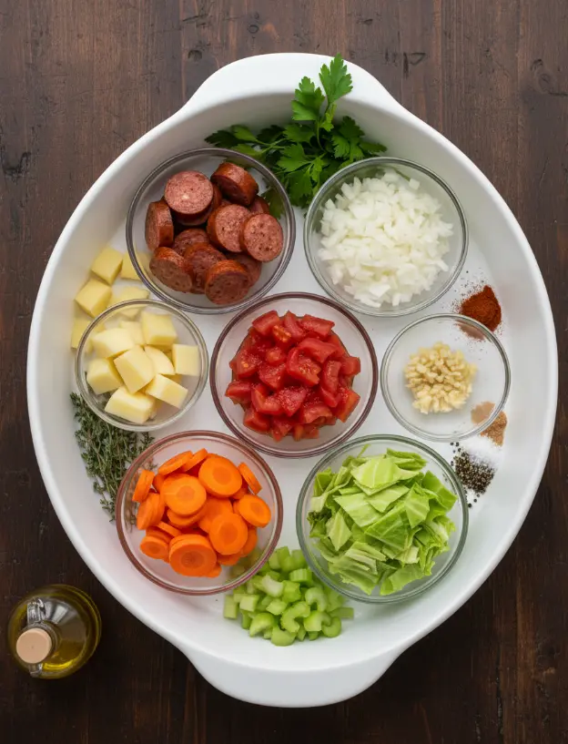 - 1 lb kielbasa, sliced: Smoky Polish sausage stars here (sub: turkey kielbasa for leaner protein or vegan sausage for plant-based).