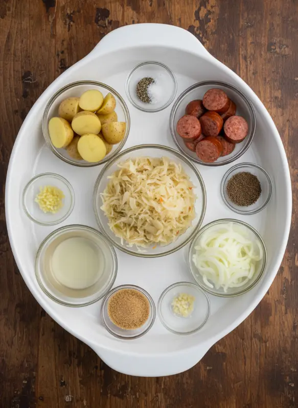 Gather these simple, pantry-staple ingredients for your kielbasa with potatoes and kraut—each one chosen for maximum flavor and that irresistible smoky-tangy crunch. This recipe serves 6 generously, perfect for family dinners or meal prep.