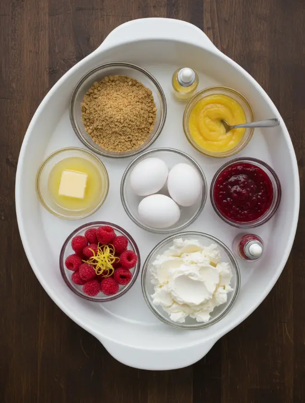 These ingredients yield a 9-inch lemon raspberry swirl cheesecake serving 12, blending classic cheesecake richness with fruit-forward innovation.