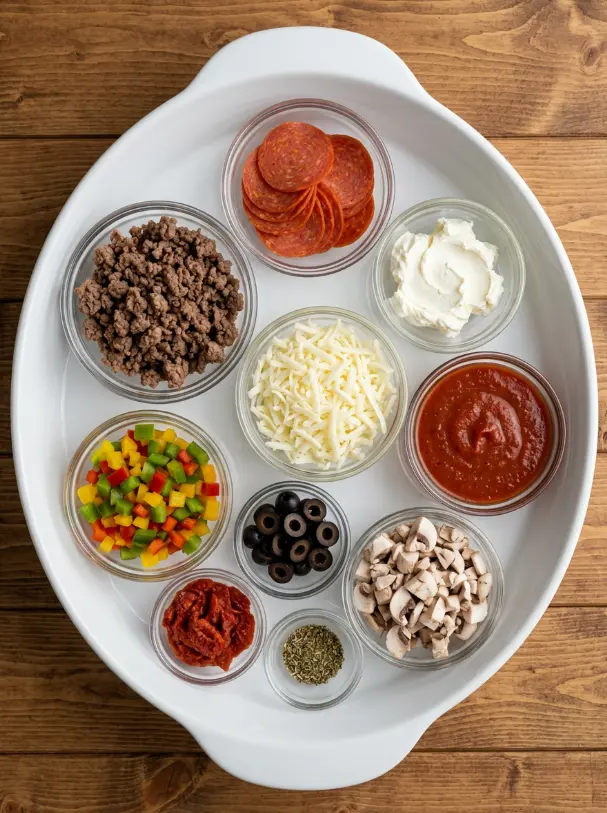 Gather these simple pantry staples for your low carb pizza casserole, and you’ll have pizza vibes in casserole form. I’ve included sensory notes and smart swaps to keep it flexible and flavorful—think melty cheese, zesty sauce, and crispy edges that scream “pizza” without the guilt.