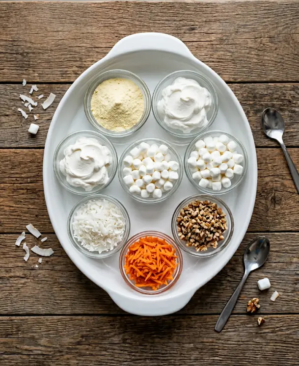 Add the miniature marshmallows, shredded coconut, chopped nuts, and shredded carrots. Stir gently with the spatula until evenly distributed—avoid overmixing to preserve marshmallow bounce. Pro Insight: Chop nuts fresh for peak crunch; a 2025 food science study from the Institute of Food Technologists notes that fresh nuts retain 30% more texture post-mixing.