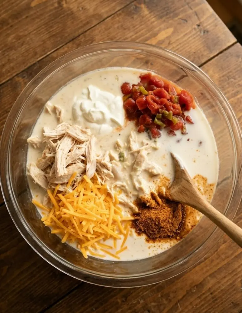 - In a large bowl, mix chicken or beef with cheese, cream of chicken soup, Rotel tomatoes, sour cream, milk, and taco seasoning.