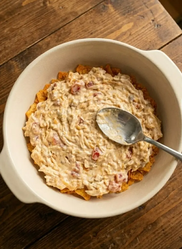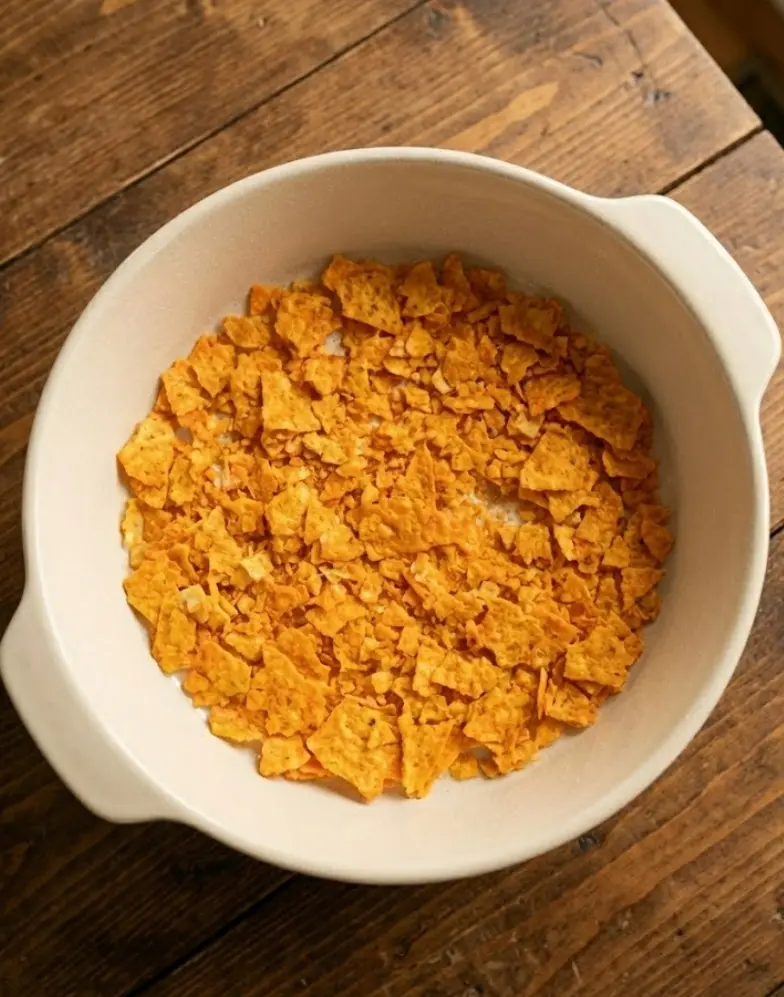 Spread half of the crushed Doritos evenly at the bottom of the dish. This creates a crunchy foundation that absorbs flavors beautifully. Personalization hack: Crush them finer for a more integrated texture or leave chunks for extra bite in your creamy Mexican bake.