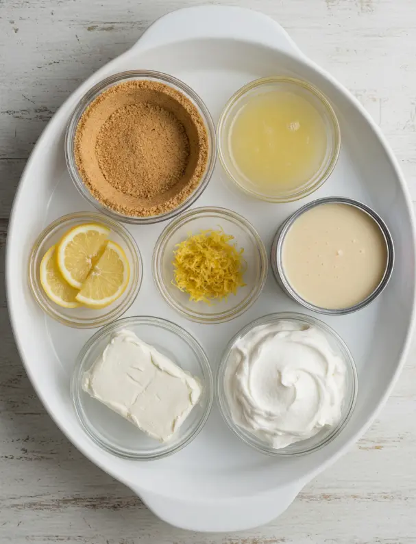 Gather these simple staples for your lemonade pie—most are pantry favorites that create a dreamy, tart-sweet filling. This recipe serves 8 generous slices, perfect for sharing.