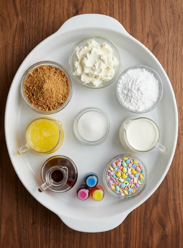 Gather these simple pantry staples for your no-bake mini Easter cheesecakes, yielding about 12 irresistible minis. I’ve included sensory notes to get your taste buds tingling and smart substitutions for dietary tweaks.