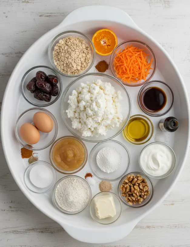 Gather these simple, pantry-staple ingredients for your no sugar cottage cheese carrot cake bars. I’ve included sensory notes and substitutions to make it foolproof and customizable—think creamy richness from cottage cheese and warm cinnamon aromas that fill your kitchen.
