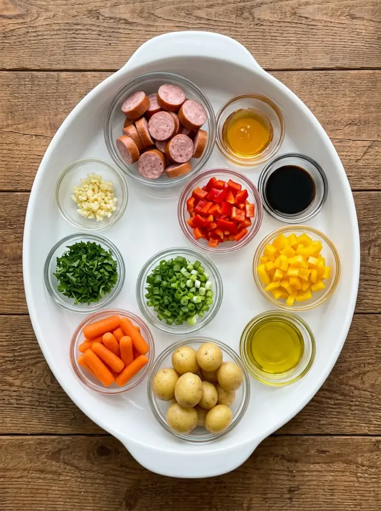 - Combine the sliced kielbasa, bell peppers, baby carrots, and baby potatoes in a large mixing bowl. Drizzle with olive oil, then add honey, minced garlic, and soy sauce. Toss until evenly coated.