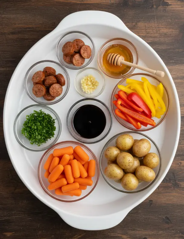 - Combine the sliced kielbasa, bell peppers, baby carrots, and baby potatoes in a large mixing bowl. Drizzle with olive oil, then add honey, minced garlic, and soy sauce. Toss until evenly coated.