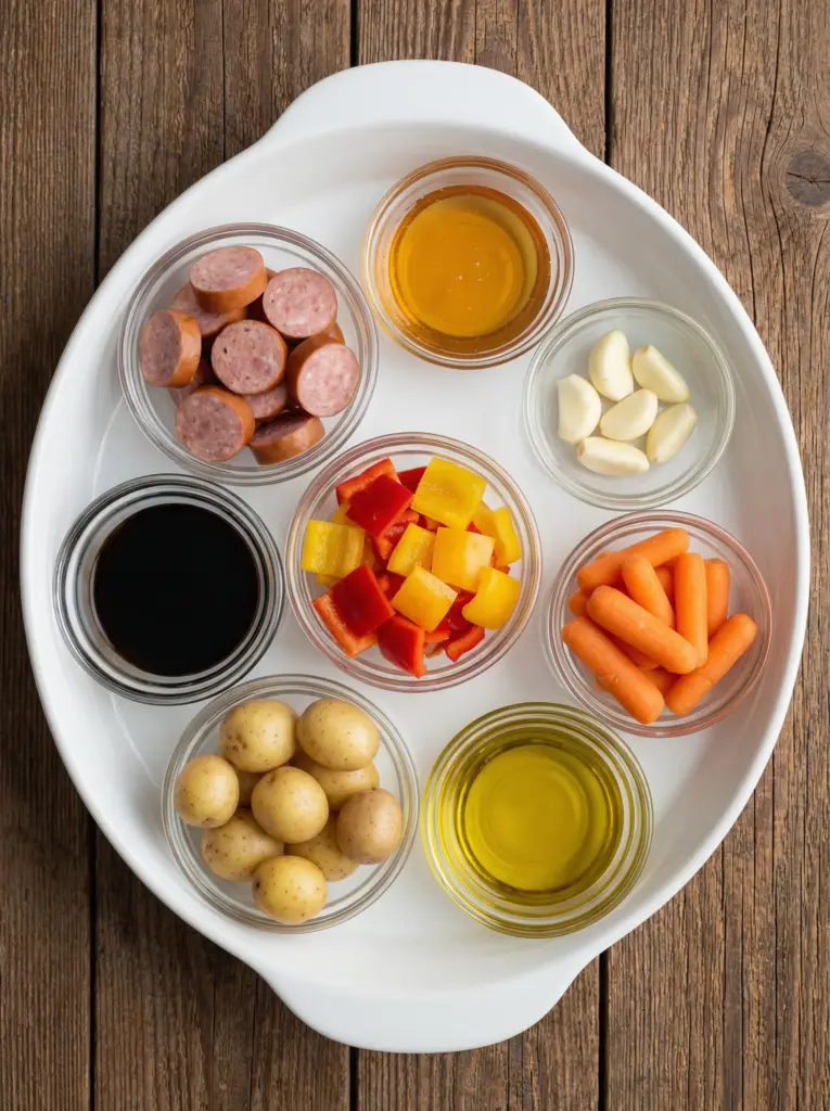 The beauty of this honey garlic kielbasa and veggies recipe lies in its short, high-impact ingredient list. Everything roasts together for maximum flavor with minimum work. Here’s what you’ll need for 4 hearty servings, plus easy substitutions: