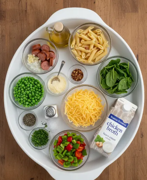 Gather these simple pantry staples for your one pot kielbasa pasta – the smoky kielbasa pairs perfectly with the velvety cheese sauce, creating an irresistible creamy texture that clings to every noodle. This recipe serves 4 generously.