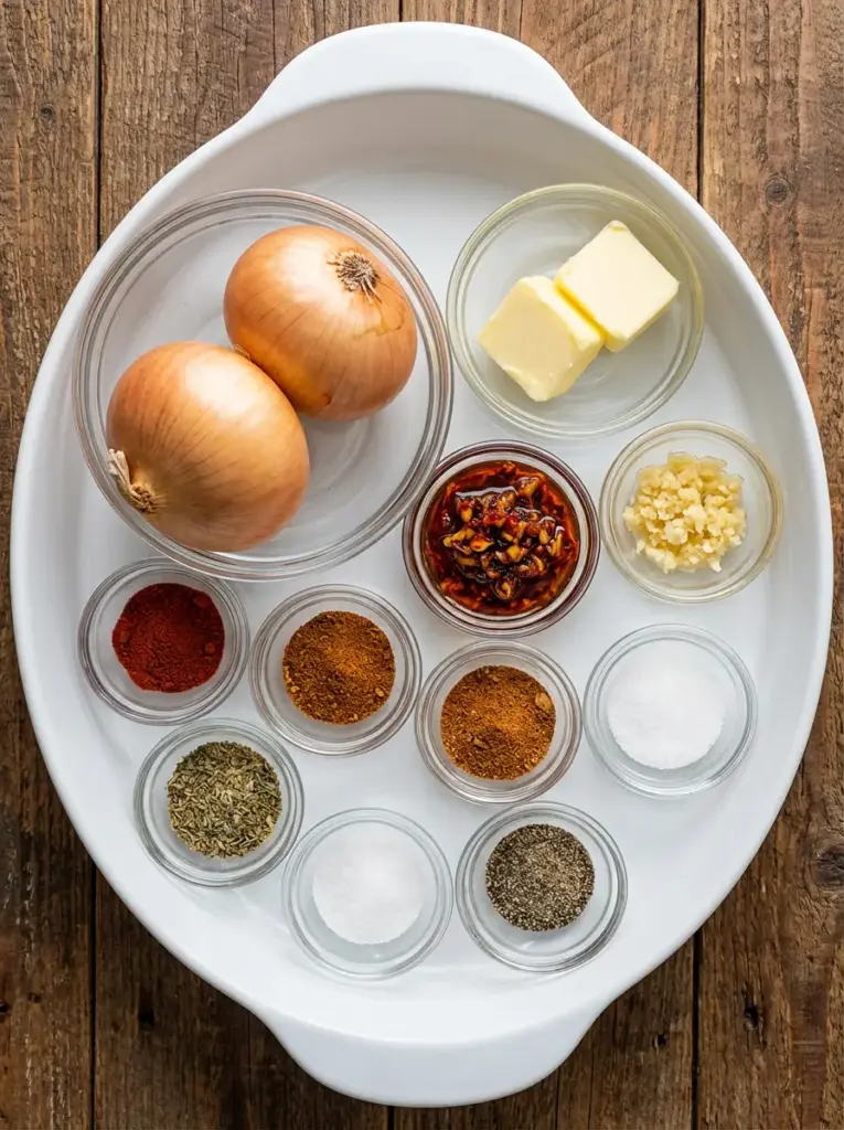 Gather these pantry staples for your onion boil recipe, where each element builds layers of smoky, spicy, and savory goodness. Imagine the sizzle of butter meeting sweet onions, infused with zesty kicks—your kitchen will smell irresistible!
