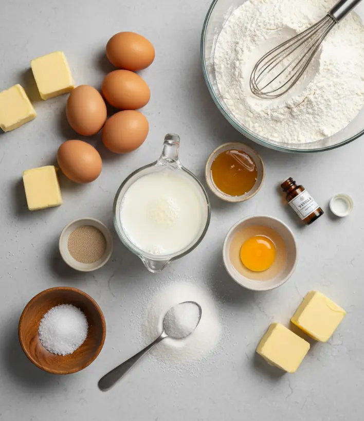 • 5 large eggs (or 4 large eggs + 2 yolks) – Creates the signature golden color and tender crumb