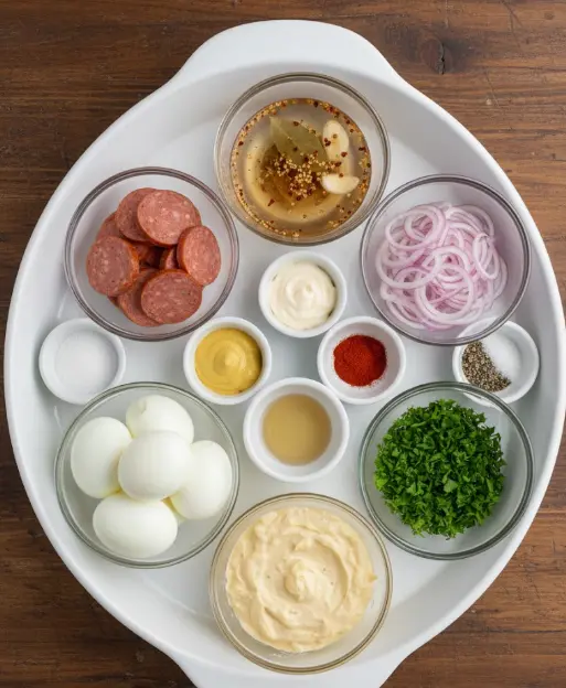 This pickled summer sausage with mustard eggs serves 6, offering a protein-packed snack with balanced macros. Data per serving (based on USDA nutrient database averages; approx. values):