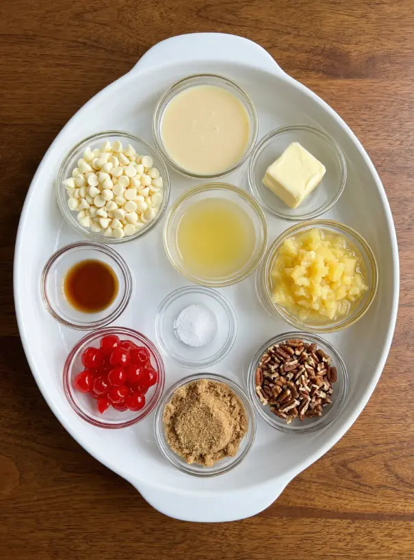 Gather these simple pantry staples for your pineapple upside down cake fudge—most you’ll already have on hand. This recipe yields about 16 decadent squares, each bursting with juicy pineapple tang, sweet cherries, and buttery crunch. High-quality ingredients ensure velvety texture and bold flavors.