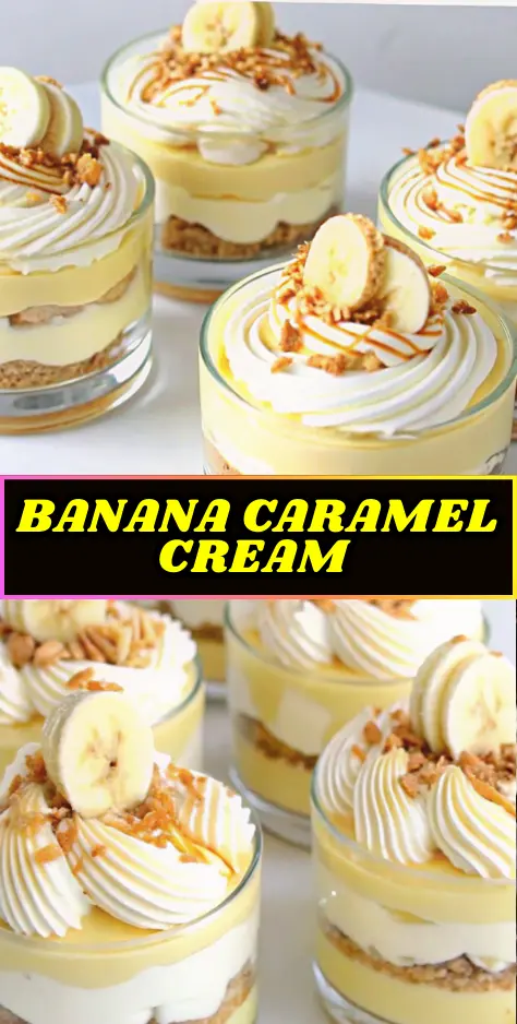 A rich and creamy Banana Caramel Cream Dessert layered with silky vanilla pastry cream, fresh banana slices, fluffy whipped cream, buttery graham cracker crumble, and luscious caramel sauce. This easy layered banana dessert is indulgent, elegant, and perfect for gatherings or quick sweet cravings.