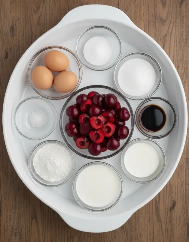 Gather these simple pantry staples and fresh produce for your cherry clafoutis—the beauty lies in its minimalism, highlighting the tart-sweet burst of cherries enveloped in a silky, pancake-like batter. Here’s everything you need for 8 servings:
