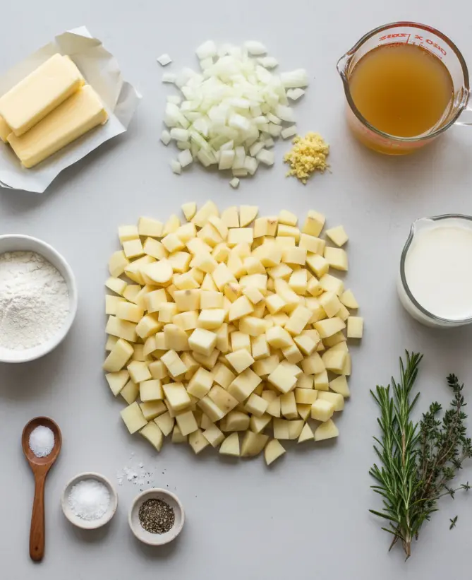 - 4 large russet potatoes (peeled and diced) – Substitute: Yukon Gold for extra creaminess