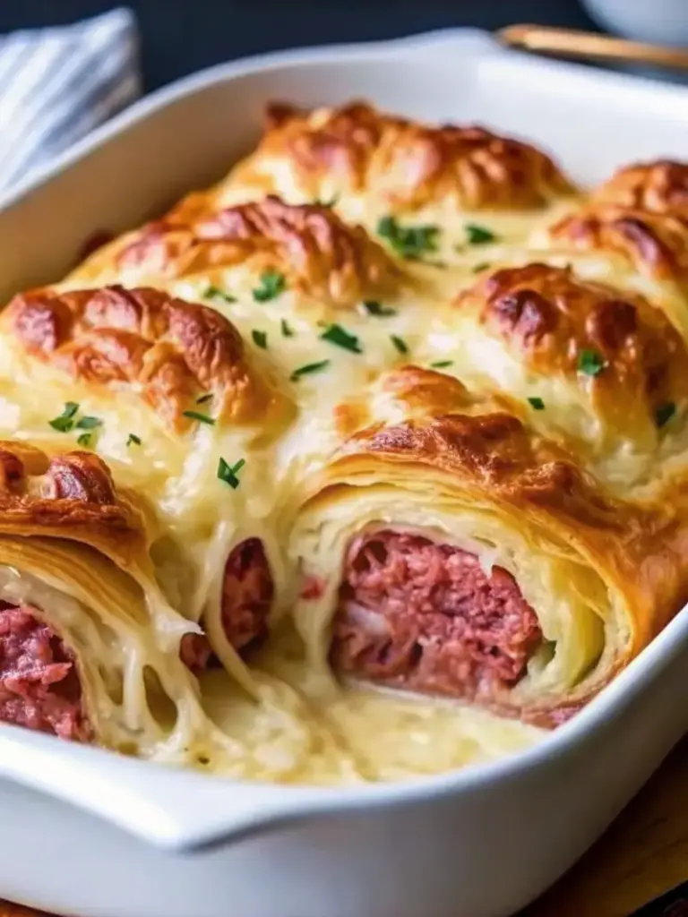 Reuben Crescent Bake is an easy, mess-free twist on the classic Reuben sandwich. Flaky crescent roll dough is layered with savory corned beef, tangy sauerkraut, melty Swiss cheese, and creamy Thousand Island dressing, then baked until golden and bubbly for the ultimate comfort food.