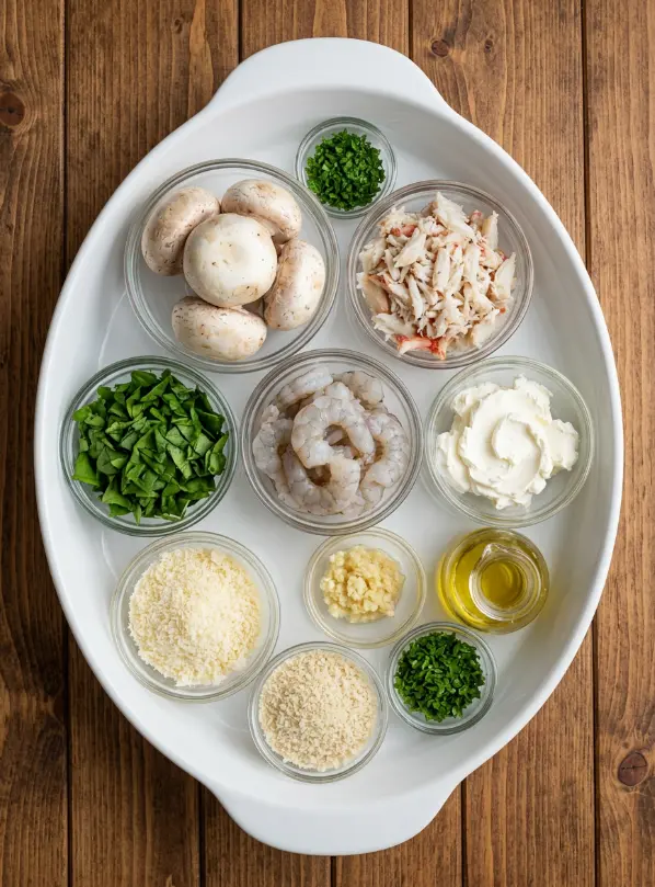 Gather these fresh, high-quality ingredients to create shrimp & crab stuffed mushrooms with spinach and Parmesan that tantalize the taste buds with their buttery seafood richness, earthy spinach notes, and golden cheesy topping. This recipe serves 6-8 as an appetizer (about 12-16 mushrooms).