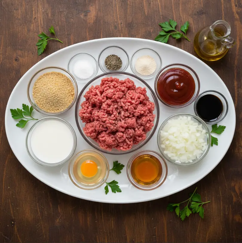 - In a bowl, gently mix ground beef, breadcrumbs, milk, egg, salt, pepper, onion, and garlic powder.