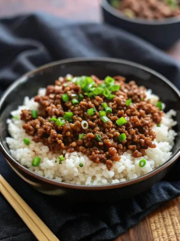 - Assemble: Divide rice into bowls, top with beef mixture, and finish with sesame seeds, green onions, and optional toppings.