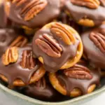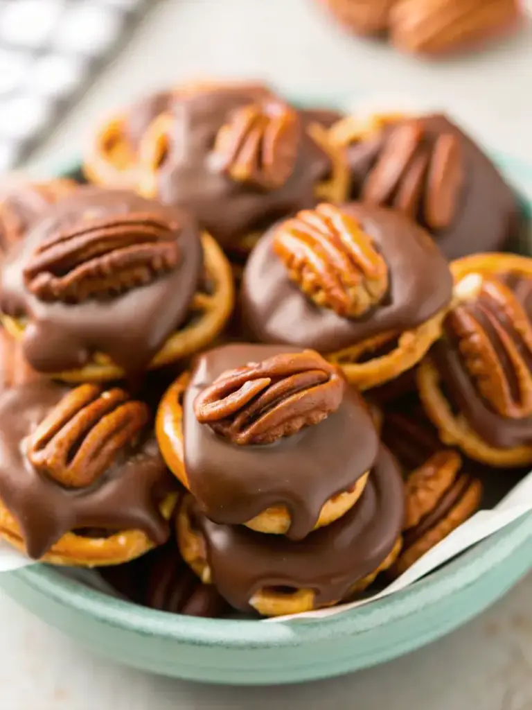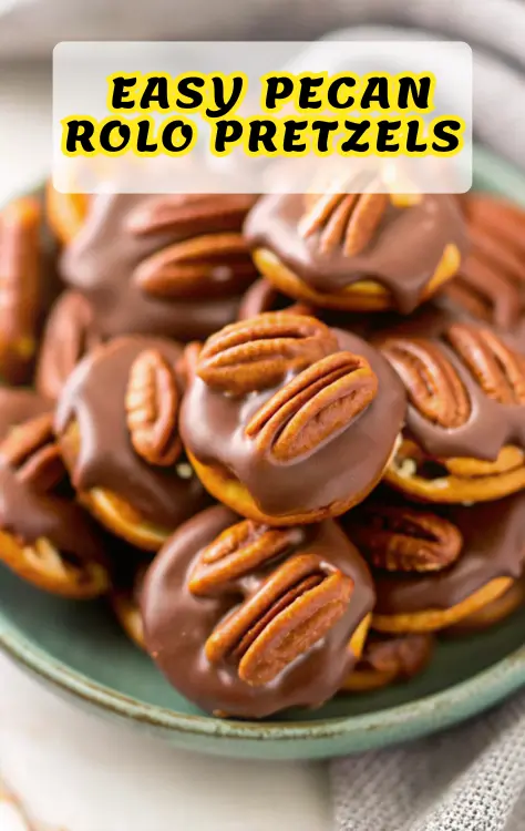Keywords: pecan rolo pretzels, holiday treats, 3 ingredient dessert, Christmas snacks, easy pretzel candy