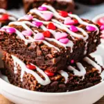 Allow the brownies to cool completely in the pan—this is non-negotiable for clean cuts. Once cooled, lift them out using the parchment overhang and slice into squares with a sharp knife dipped in hot water (wipe between cuts for clean edges). Melt your Ghirardelli chocolate wafers according to package instructions and drizzle artistically over each square. Immediately add Valentine’s sprinkles before the chocolate sets. For extra flair, use red and white melting wafers to create heart designs or write “Love” on each brownie.