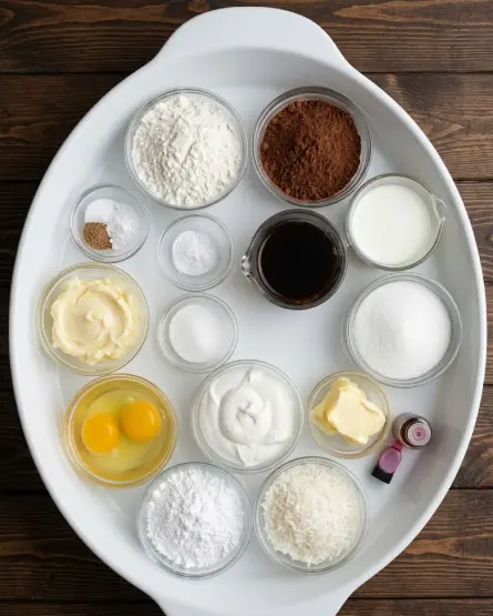 - Whisk together flour, cocoa powder, baking soda, baking powder, and salt.