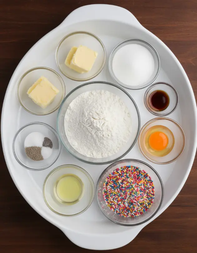 These ingredients promise a sensory explosion: the butter’s silky smoothness, sugar’s gentle crunch, and sprinkles’ festive pop.