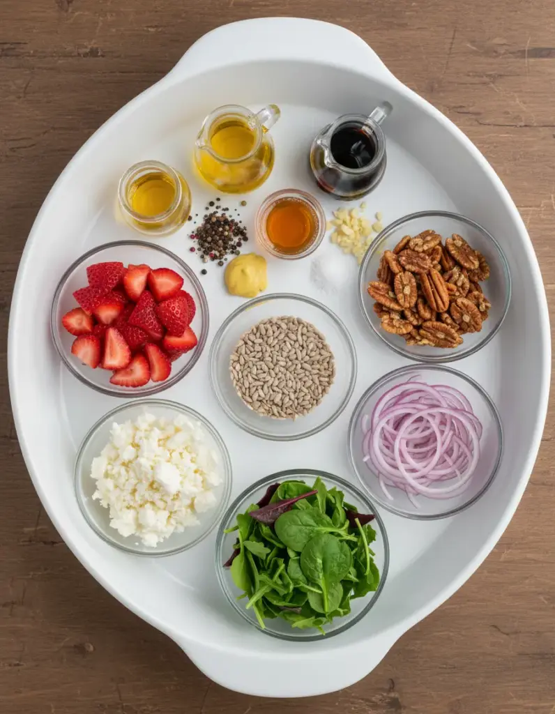 In a small bowl or mason jar, whisk together ¼ cup olive oil, 2 tbsp balsamic vinegar, 1 tbsp honey, 1 tsp Dijon mustard, minced garlic, ¼ tsp salt, and ¼ tsp black pepper. Whisk vigorously for 30-60 seconds until emulsified and glossy. Taste and adjust—add a squeeze of lemon for brightness if your strawberries aren’t super sweet. Let it sit 5 minutes for flavors to meld. Tip: Shake in a jar for no-mess blending; this dressing doubles for grilled veggies!