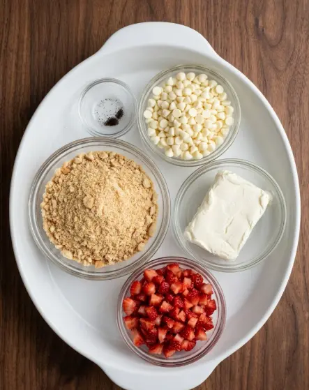 Beat softened cream cheese until fluffy. Fold in chopped strawberries + wafer crumbs (and vanilla/salt if using). Mixture will be soft but should hold together when squeezed.