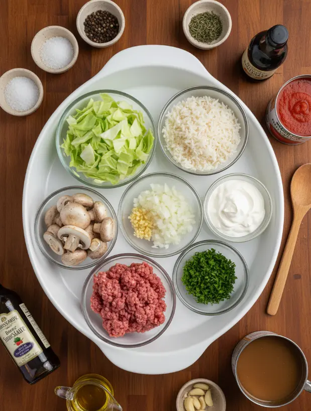 Gather these fresh ingredients for your cabbage rolls recipe, and get ready for a symphony of savory, earthy flavors—the cabbage wraps hug the meaty filling like a warm embrace, while the mushroom sauce adds a creamy, umami punch.