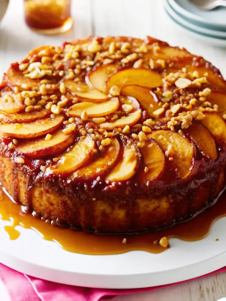 8. Cool for 10–15 minutes, then invert onto a serving plate. Lift pan gently to reveal caramelized apple topping.