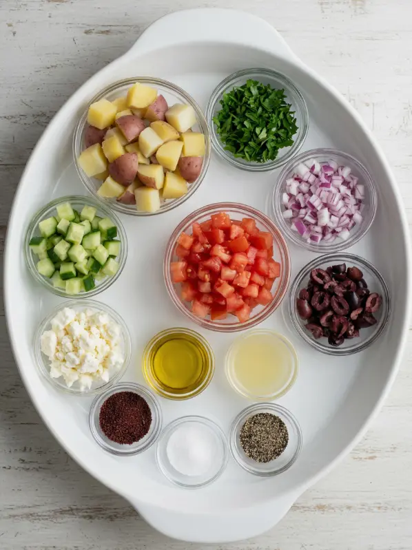 Gather these fresh, simple ingredients for your Turkish potato salad – they create a symphony of crunchy textures and bright tastes that scream summer. This recipe serves 6-8 as a side, scaling easily for crowds.