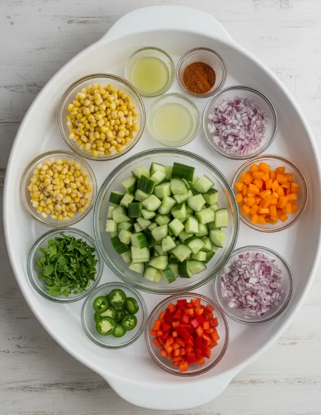 Start by washing all produce. Slice the cucumbers into half-moons for bite-sized perfection—aim for 1/4-inch thickness to retain crunch. Dice bell peppers into 1/2-inch pieces for even distribution. Shuck fresh corn or thaw frozen kernels. Finely chop red onion, cilantro, and jalapeño. Pro tip: Soak onions in ice water for 5 minutes to mellow their bite without losing flavor. Toss everything into a large mixing bowl for a colorful veggie fiesta that screams summer freshness.